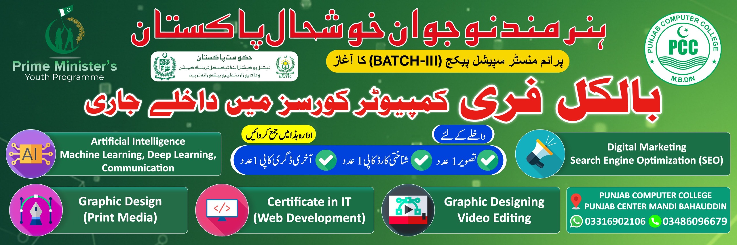 Punjab Computer College offer short and advance courses under qualified staff and provide very educational environment. Punjab computer college is only registered institute in the city. Our courses are according to the market requirements. Totally focus on practical rather than theory. Use courses menu to see detail of our courses.